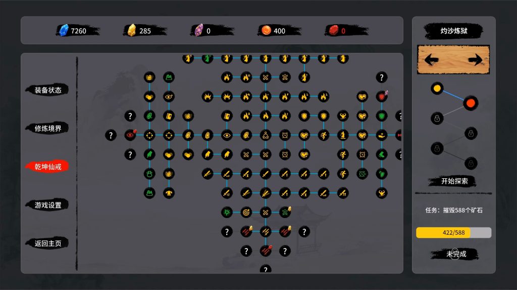 你需要利用各类资源,一步步修复仙戒,解锁更多能力,同时提升修为——从练气直至渡劫,逐步突破境界瓶颈。最终的目标,便是那传说中的:破碎虚空,羽化成仙!