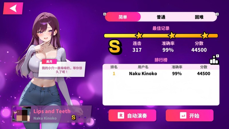 - 自动演奏:通关后解锁无人干扰的观赏模式,音符自动完美判定,尽情欣赏她为你高潮的每一帧!