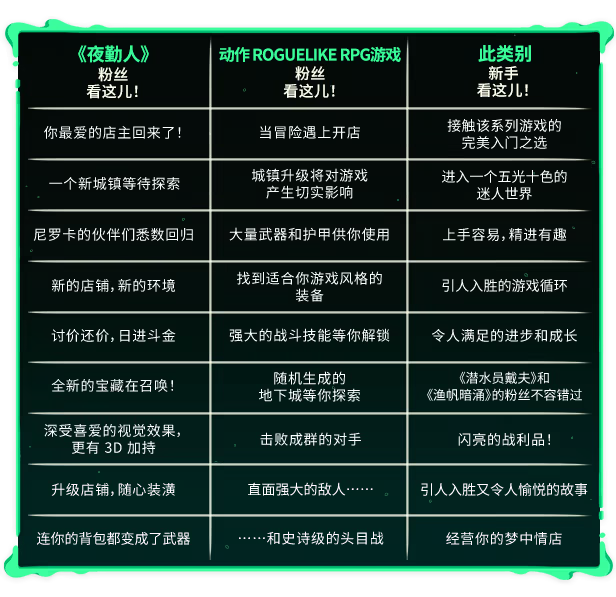 深入探索具有 Roguelike 元素的动作类角色扮演游戏,亲身体验关于新起点的传奇故事。你和其他村民被困在了偏僻的特雷斯纳村。身无分文的你,必须打起精神,重整旗鼓,把你那简陋的小店打造成村庄的财富中心。探索危险重重的地下城,收集珍奇物品并进行贩售,再用收入投资朋友的生意。不断解锁全新的武器、盔甲和店铺装饰,当然还有更重要的任务——带来希望,让大家相信事态终有转机。