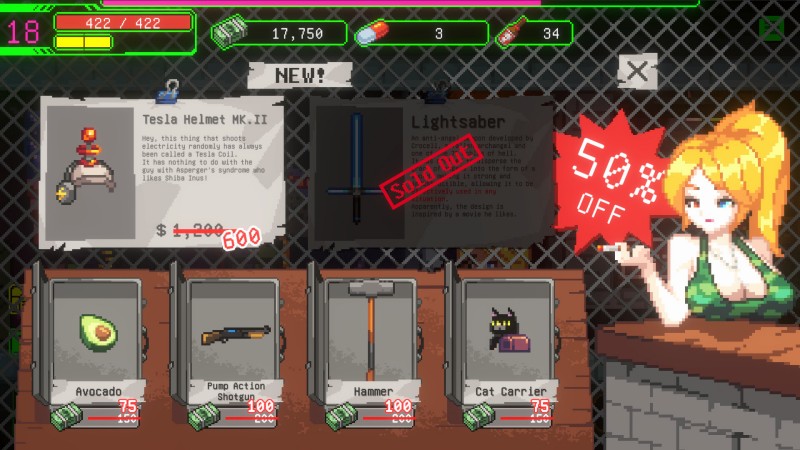 在战斗中赚取金钱,购买武器图纸,打造从激光般的利刃、传说级遗物…到可爱的猫猫武器。 - 通过战斗商店进行升级。