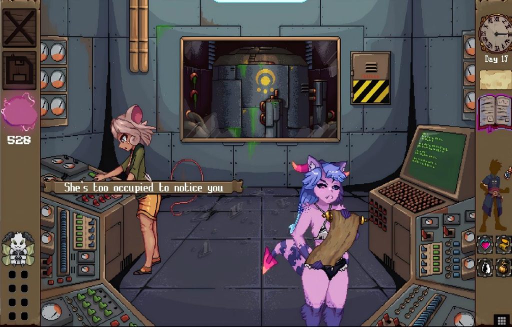 2D像素类策略游戏,使用使魔探索地牢并收集瑟瑟能量,如果探索中被怪物追上就会进入战斗,解开地牢的手势可从魔法书里得到提示,在时钟的下面有个地图,里面标记着你现在该去的地方。单击角色还可以更换性别,可S可M,在画廊里更换魔物娘的衣服,她在游戏里就会变成你更换的着装