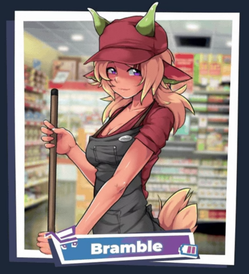 在镇上的便利店里,你会看见布兰布尔正在柜台整理货物。虽然应付客人总是让她手忙脚乱,但当店铺打烊后,独自留守的时光又难免有些寂寞。若你恰巧在这样寂静的时刻推门而入,或许会听见某种嗡嗡的震动声……别太在意,就当是思乐冰机器在运作吧。