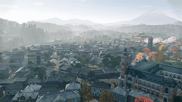 幕末时期的江户、横滨和京都融合了日本和西方元素,在开放世界中探索这些城市美丽的街景,感受樱花飞舞和红叶纷飞等季节变化。玩家可以使用“钩绳”爬上屋顶,或通过滑翔装置“阿鼻机流”从空中移动,还可以使用“拍照模式”捕捉喜欢的风景。