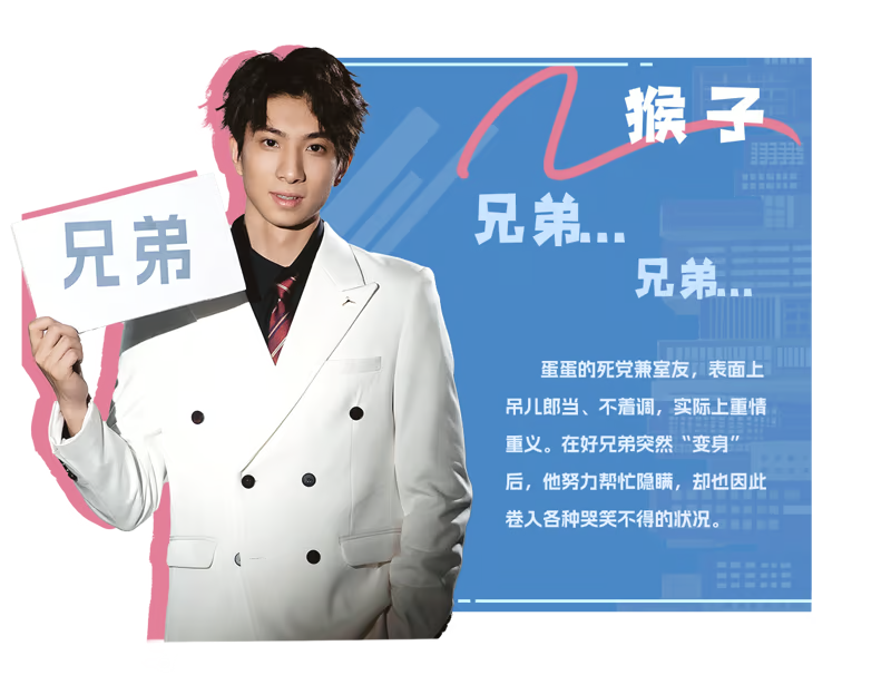 猴子:蛋蛋的死党兼室友,表面上吊儿郎当、不着调,实际上重情重义。在好兄弟突然“变身”后,他努力帮忙隐瞒,却也因此卷入各种哭笑不得的状况。