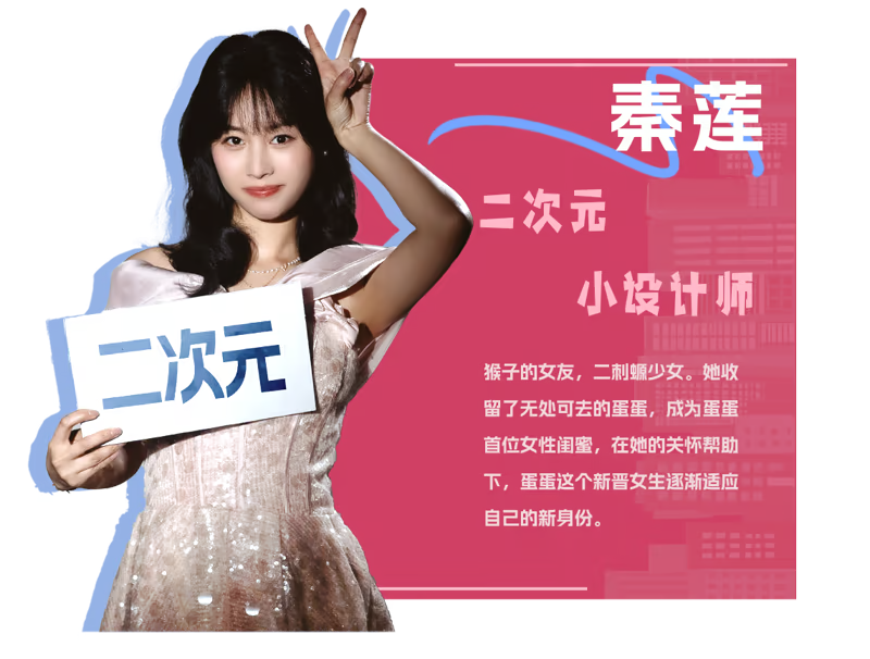 秦莲:猴子的女友,二刺螈少女。她收留了无处可去的蛋蛋,成为蛋蛋首位女性闺蜜,在她的关怀帮助下,蛋蛋这个新晋女生逐渐适应自己的新身份。