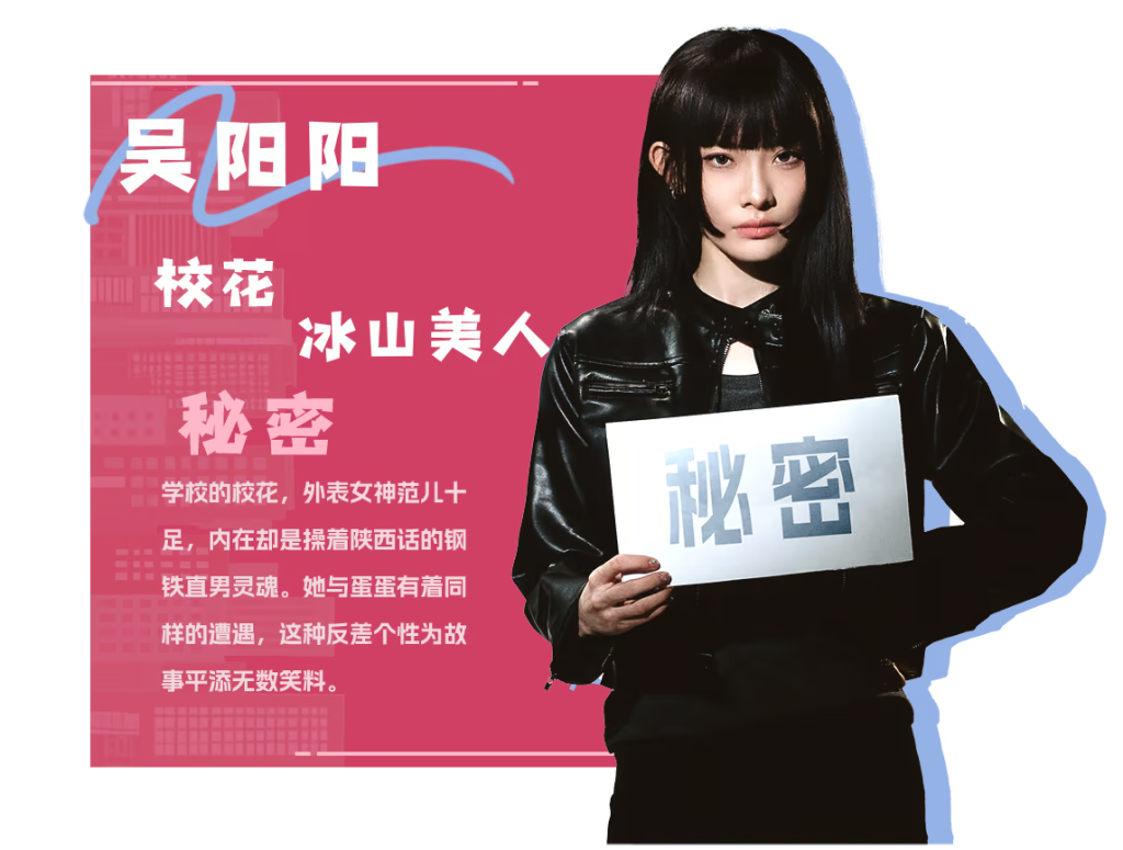 吴阳阳:学校的校花,外表女神范儿十足,内在却是操着陕西话的钢铁直男灵魂。她与蛋蛋有着同样的遭遇,这种反差个性为故事平添无数笑料。