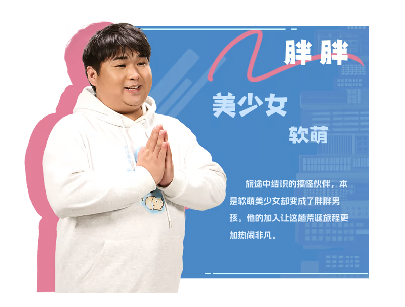 胖胖:旅途中结识的搞怪伙伴,本是软萌美少女却变成了胖胖男孩。他的加入让这趟荒诞旅程更加热闹非凡。