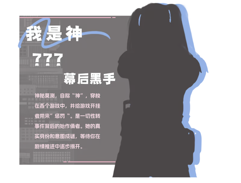 “我是神”:神秘莫测,自称“神”,穿梭在各个游戏中,并给游戏开挂者带来”惩罚“。是一切性转事件背后的始作俑者。她的真实身份和意图成谜,等待你在剧情推进中逐步揭开。