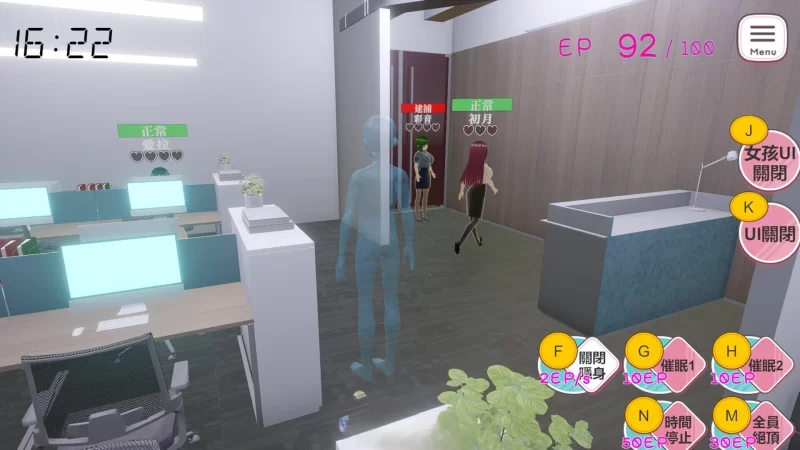 玩家可以用滑鼠或键盘操作角色在场景中自由移动,使用超自然力量,使用停止时间、放置陷阱、全员高潮等技能。