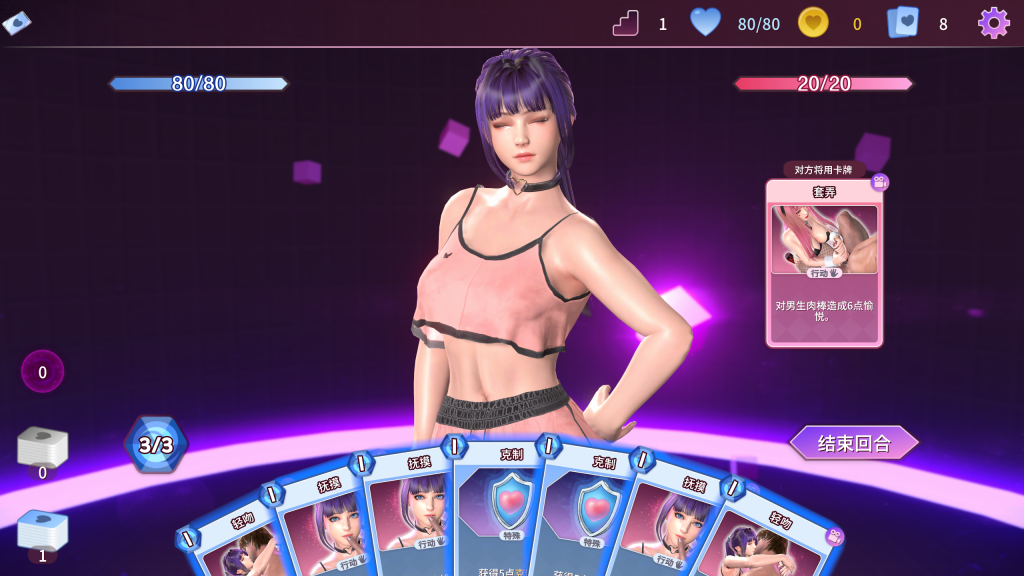 玩家在随机生成的地图中,构筑卡组,并使用卡牌与女孩进行对战,使用不同的卡牌选择女孩的不同部位造成伤害。
