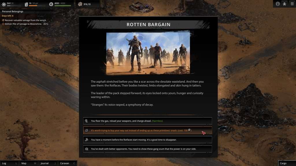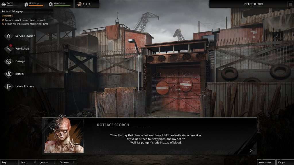 “一切都没有按计划进行。你早晚会失去对炼油厂的控制权。而且……这确实发生了。致命的“锯齿”发动袭击并夺走了你的一切。你的朋友维克多死了。燃料没了、设备没了、伙伴们都离开了。是时候用废品组装你的第一辆车,召集新团队成员,重新回到正轨。抓紧时间,因为“大风暴”就要来了。