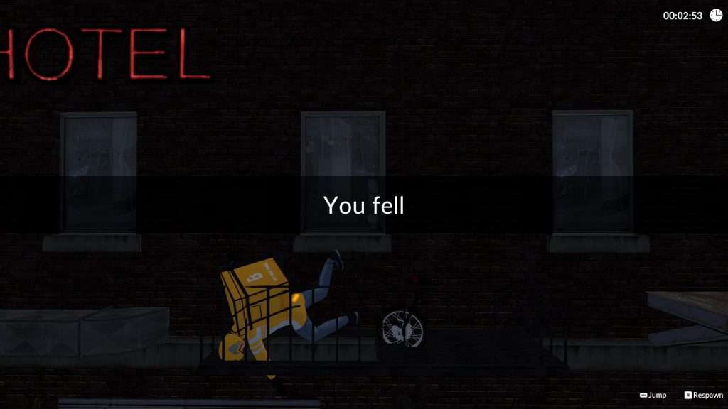 你不仅要保持自己不摔倒,还要确保披萨盒不掉落。剧烈的颠簸、撞击和摔倒都可能导致披萨从车上飞出去。如果披萨损坏得太严重,任务就可能失败! - 应对障碍与环境: