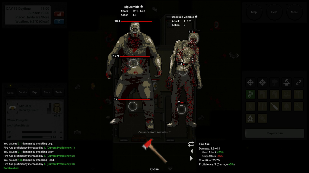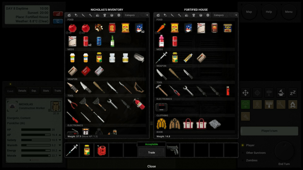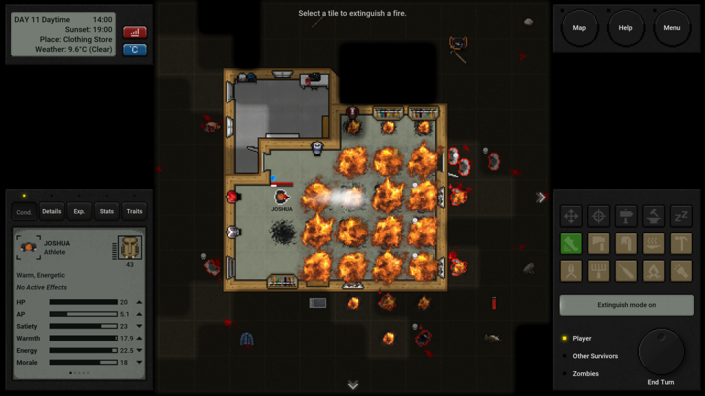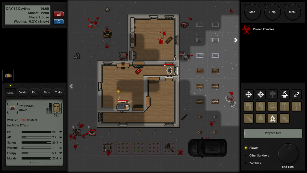 谨慎选择你的下一步行动!你所做的每一个动作和决定都会消耗你的行动点数(AP)。合理管理你的AP是 生存的关键。用得太少,你可能找不到生存所需的资源。用得太多,你可能会让自己暴露在危险之下。